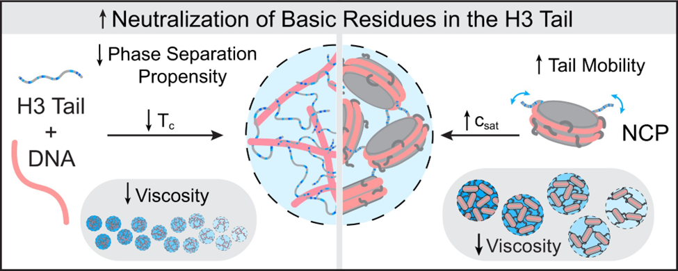 This study explores how chromatin organizes into distinct nuclear microenvironments via phase separation. By modifying charge patterns in the H3 histone tail, the researchers showed that specific regions influence nucleosome phase boundaries and condensate viscosity. Nuclear magnetic resonance revealed that H3 tails remain mobile within condensates, with mobility linked to viscosity. These findings highlight how the number, type, and arrangement of basic residues in H3 tails regulate nucleosome phase separation, suggesting that nucleosomes and their modifications actively shape local chromatin environments.